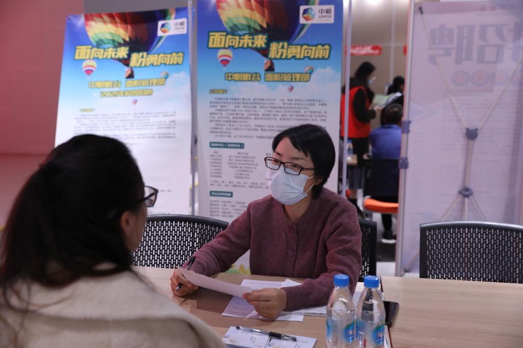 招聘会现场,各企业通过海报、单页等形式进行宣传,同学们在志愿者的引导下走到各企业的展位前,递交简历,并进行现场面试。在企业工作人员的讲解下,同学们了解到了心仪企业的发展方向、岗位需求、招聘人才要求等信息。除毕业生外,其他年级的学生也来到现场感受求职氛围,提前了解就业形势,现场气氛十分活跃。