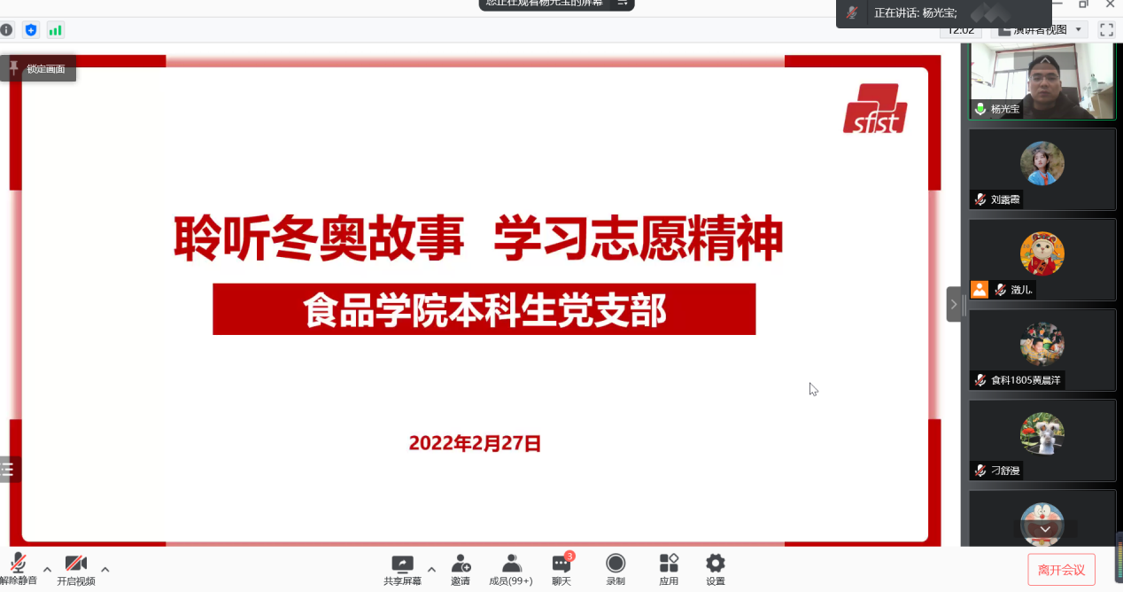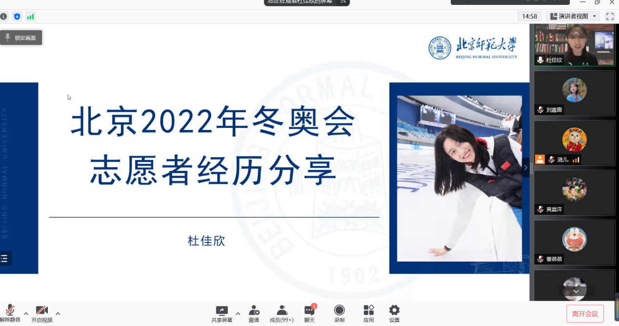 杨光宝同志首先对2022年北京冬季奥会的成功举办进行简要介绍,随后杜佳欣同志从工作内容、志愿故事、母校经历和经验体会四个方面展开分享,并与支部同志进行热烈互动。