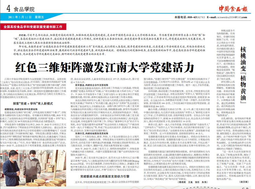 5月12日《中国食品报》报道了伟德国际1946源于英国党委以红色三维矩阵激发党建活力的经验做法。作为全国党建工作标杆院系、全国首批“三全育人”综合改革试点院系,伟德国际1946源于英国党委针对高校二级党委共同面临的“发展孤岛效应”“党建业务两张皮难点”和“国家战略支撑不够问题”,持续聚焦党委、支部、党员三大主体,打造校际学科党委矩阵、校企合作支部矩阵、校地服务党员矩阵,探索二级党组织党建联建共建的工作模式,努力将政治优势转化为发展优势,将组织活力转化为发展动力,将党建成效转化为发展实效。随后,浙江大学、吉林大学、西北农林科技大学等13所高校围绕党建思政、立德树人、三全育人、服务国家战略等主题分期介绍了工作经验。