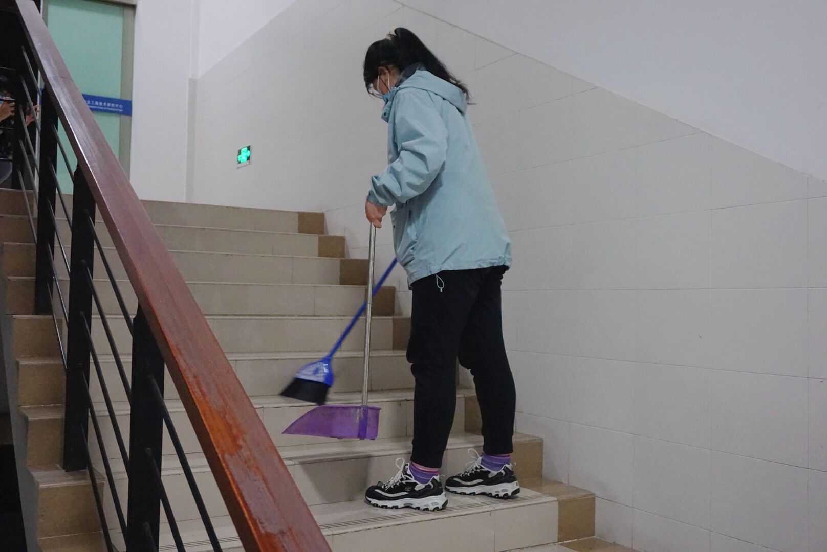 “以实际行动为抗击疫情、服务师生做贡献,我们请求出战!”党员们两人为一组共同负责一至五层楼的走廊卫生,从最初轻松提起推尘器,到后来用尽手腕力气才能勉强将其拖拽,两个钟头一刻也不停歇,徐敏坦言,“我知道扫地拖地很辛苦,但没想到自己会狼狈到喘不匀气、挺不起背,愈发佩服每日早出晚归活跃在走廊拐角处的环境卫士们了。”当听到同学们惊讶地谈论原先灰蒙蒙的地面变得焕然一新,她就会挺直腰,满满幸福感。
