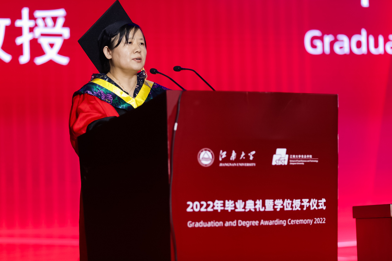 院长刘元法教授向全体毕业生致以临别寄语。他指出:“人以德为先,民以食为天。厚德载物,厚物载德,此物为食品也”。他叮嘱同学们身处百年未有之大变局,面对纷繁多元的社会,要从更好满足人民美好生活需要出发,树立“大食物观”,争做“未来食品人”,具体而言:一要做食品人,更要打破食品的边界;二要做中国食品人,更要做世界食品人;三要做食品人,更要做补天人。他希望同学们奔跑在历史大潮和人生实践中,尽情挥洒江南食品人的青春力量。