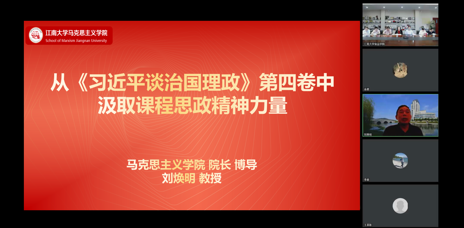 刘焕明教授在学习报告中重点从高校教师的视角,以课程思政为结合,指出新时代的高校教师学思践悟《习近平谈治国理政》第四卷的思想精髓,要强化育人意识,提升育人能力,聚焦培养堪当民族复兴重任的时代新人,深入挖掘课程所蕴含的思想政治教育资源,增强知识传授与价值引领的有机融合;要着眼“三全育人”,以树人为核心、以立德为根本,遵循思想政治工作规律、教书育人规律和学生成长规律,把思想政治教育贯穿人才培养全过程;要在学习中把自己摆进去、把职责摆进去、把工作摆进去,用党的创新理论武装自己、指导教育教学工作,在知行合一、学以致用上下功夫。