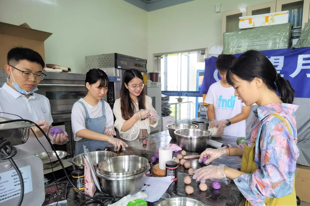 活动现场,教工党员和学生党员热情高涨,取面团、擀面皮、揉圆润、压平整、包馅料、压模具、整包装……大家分工合作、齐心协力,温情做皮、幸福做馅,伴随着欢声笑语,完成了一份份象征团圆与美好祝愿的益生菌月饼!