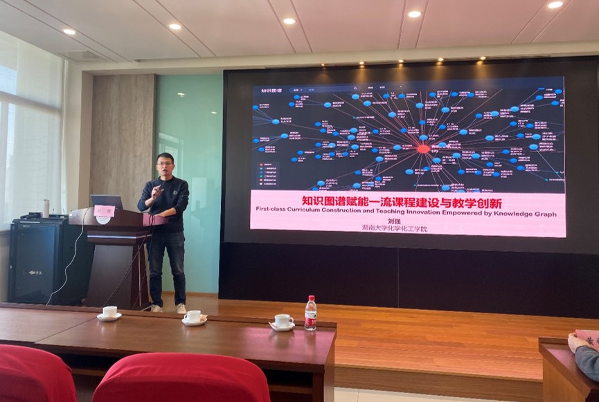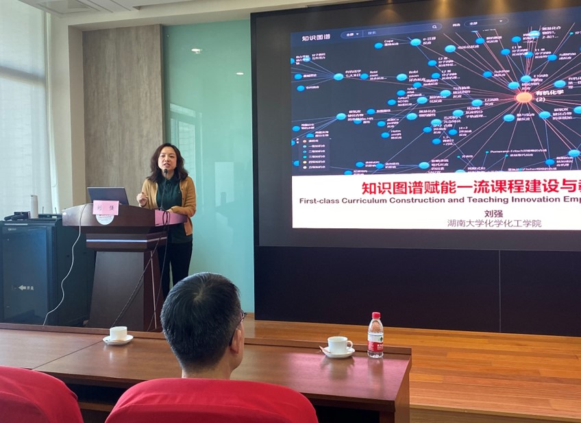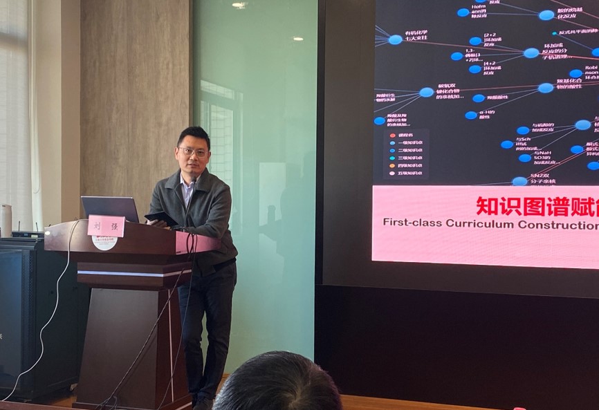 随后,刘强作题为“知识图谱赋能一流课程建设和教学创新”的精彩报告。他从教育数字化转型和知识图谱、知识图谱构建及其关系辨析、知识图谱如何赋能一流课程建设、知识图谱如何赋能混合式教学创新,四个主要方面进行了详细的介绍和分享。同时引用大量的案例和数据,展示了知识图谱在化学化工领域的应用和效果,引发了现场教师的强烈共鸣和热烈讨论。他还介绍了湖南大学化学化工学院在知识图谱方面的探索和实践,包括建立了化学化工知识图谱平台、开发了基于知识图谱的智能教学辅助系统、推进了基于知识图谱的混合式教学模式等。他鼓励伟德国际1946源于英国的教师积极利用知识图谱,创新教学方法和学习方式,提升教学质量和学习效果。