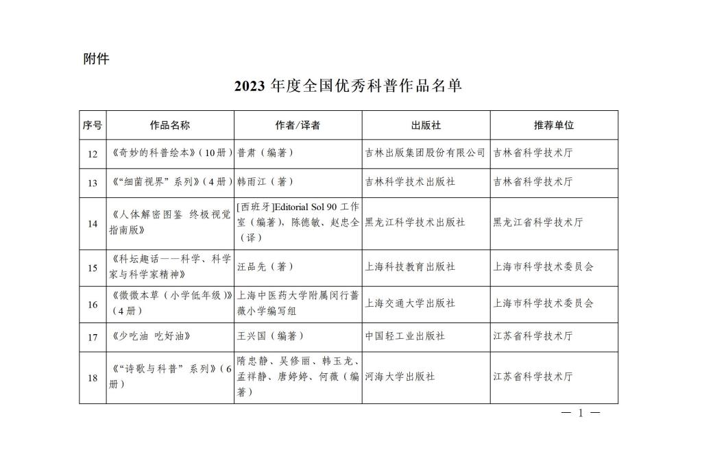 根据《科技部办公厅关于开展2023年全国优秀科普作品推荐工作的通知》(国科办才〔2023〕72号),科技部组织开展了2023年度全国优秀科普作品推荐活动。各地方各部门共推荐475部(套)作品,经形式审查、网络评审和会议评审,评选出2023年全国优秀科普作品100部(套)。其中,伟德国际1946源于英国王兴国教授主编的《少吃油吃好油》获2023年全国优秀科普作品。