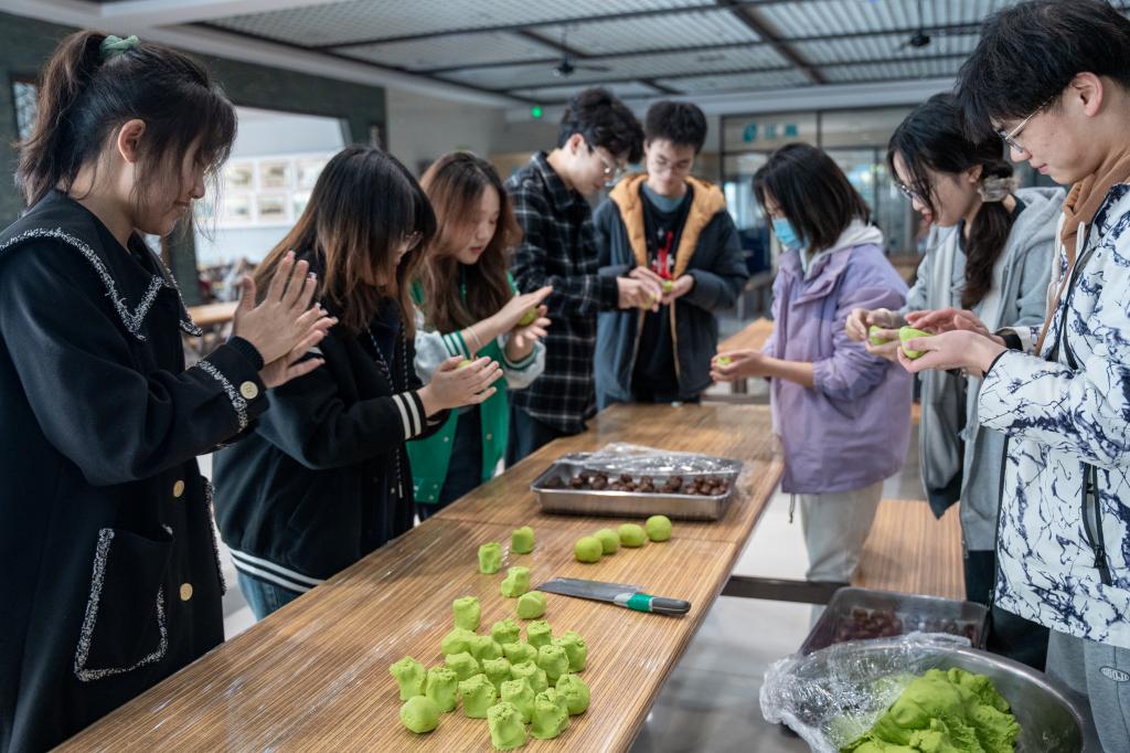 前期准备工作完成后,食堂工作人员为大家亲手示范青团的制作过程并进行详细讲解。参与活动的同学们逐渐找到了制作青团的要领,部分参与者还运用自己的创造力在青团原本的基础上进行“翻新”,整个过程充满欢声笑语。