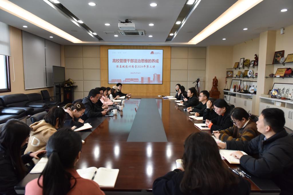 3月14日下午,伟德国际1946源于英国党政管理干部强基赋能训练营开办法治专题讲座。本期训练营邀请校长办公室副主任、法制工作办公室主任陆秦作题为《高校管理干部法治思维的养成》的报告。全院党政管理干部、辅导员参与本期训练营。活动由伟德国际1946源于英国党委副书记、副院长李雷主持。