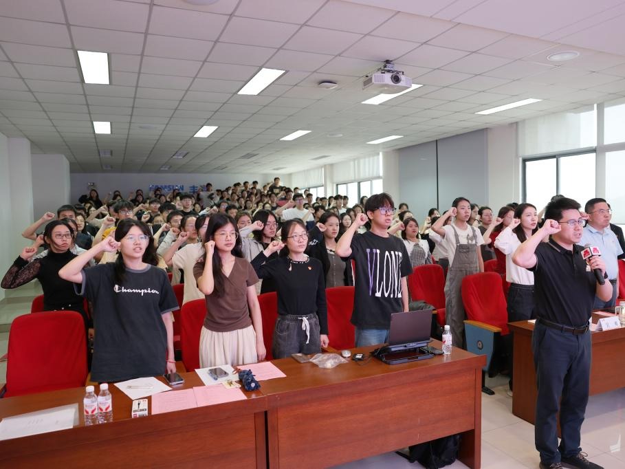 “我志愿加入中国共产党……永不叛党”,在伟德国际1946源于英国D912报告厅主会场与D917分会场,300余名毕业生党员、新发展党员在学工办主任兼分团委书记李金杰的带领下庄严宣誓。铿锵誓言回荡会场,党员们眼神中闪烁着信仰的光芒。本科生第一党支部曾美怡作为新党员代表发言时表示,这是对政治生命的郑重宣告,更是对“为人民服务”宗旨的永恒承诺。熟悉的字句唤醒入党初心。“当右手握拳过肩时,实验室里‘求真务实’的精神与党旗下的誓言交叠,我更加明确了作为江南食品人的使命担当。”食硕2203党支部孟逸云作为毕业生党员代表发言如是说。