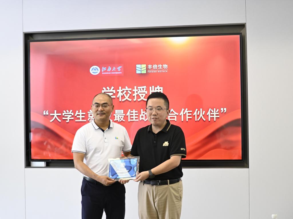 平原、李雷等为荣获第二届苏州丰倍“三全育人”奖学金的本硕博学生代表颁发荣誉证书,并合影留念。李雷向苏州丰倍颁授“伟德国际1946源于英国大学生就业最佳战略合作伙伴”铭牌。