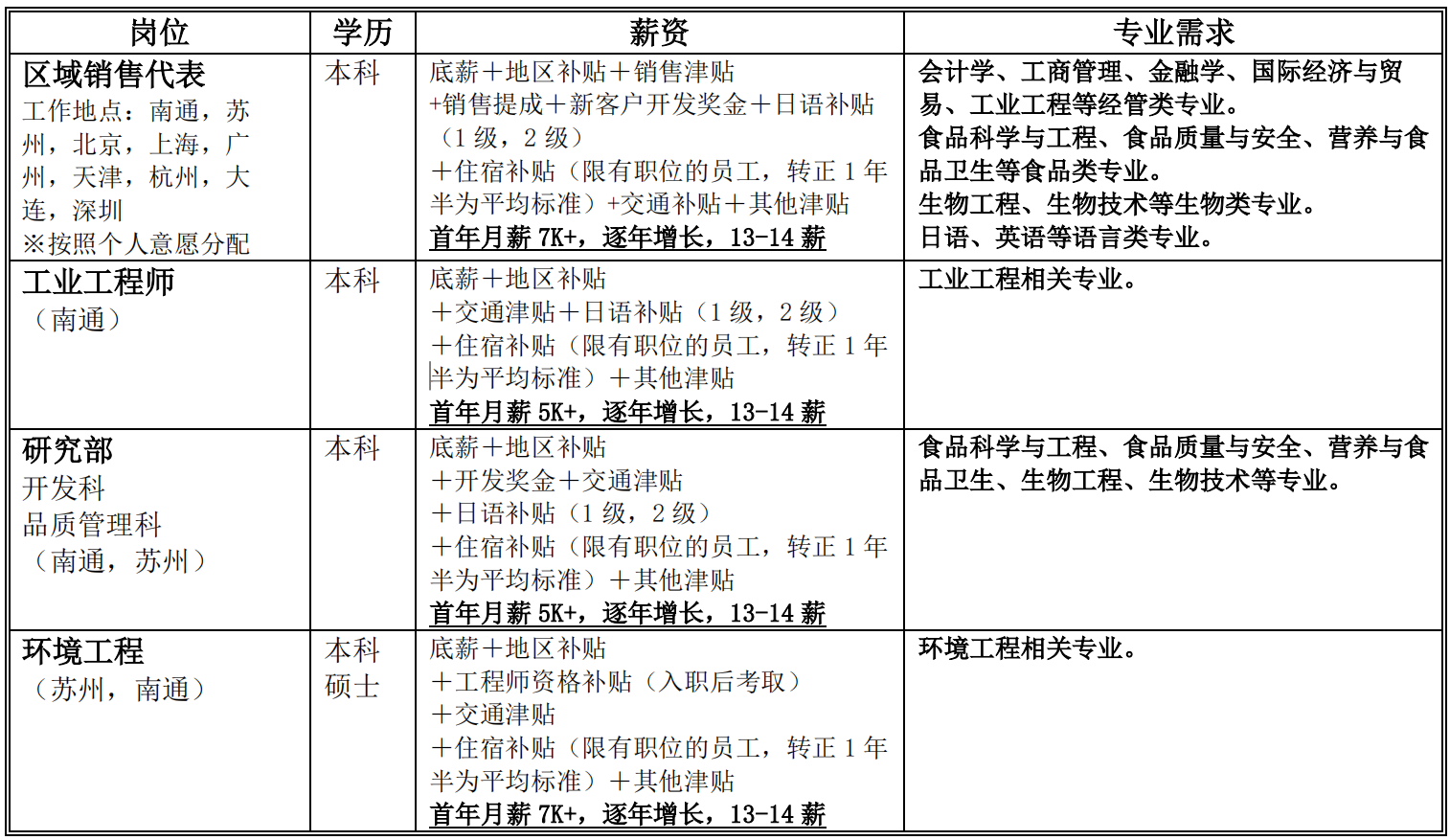 为了给大家呈上活用日本国内特有技术的混合调味品的“美味”和“便利”,应对中国国内不断扩张的市场,我们于 2007 年 1 月在江苏省苏州市成立了苏州食研食品有限公司,于 2016 年 6 月在江苏省南通市设立了食研食品(中国)有限公司,并于 2018 年 10 月在南通开发区竣工并运转。公司主要从事日式调味品的生产和销售,客户遍布全球。除南通总公司之外,我们在北京、大连、苏州、上海、广州、杭州、天津、深圳都设立了销售分公司。在武汉、青岛等地也开始了分公司的筹备工作。入职后的工作地点,会按照个人的意愿进行分配。随着市场的不断扩大,我们会逐步在各大城市成立新的分公司。诚挚地邀请各位同学的加入。
