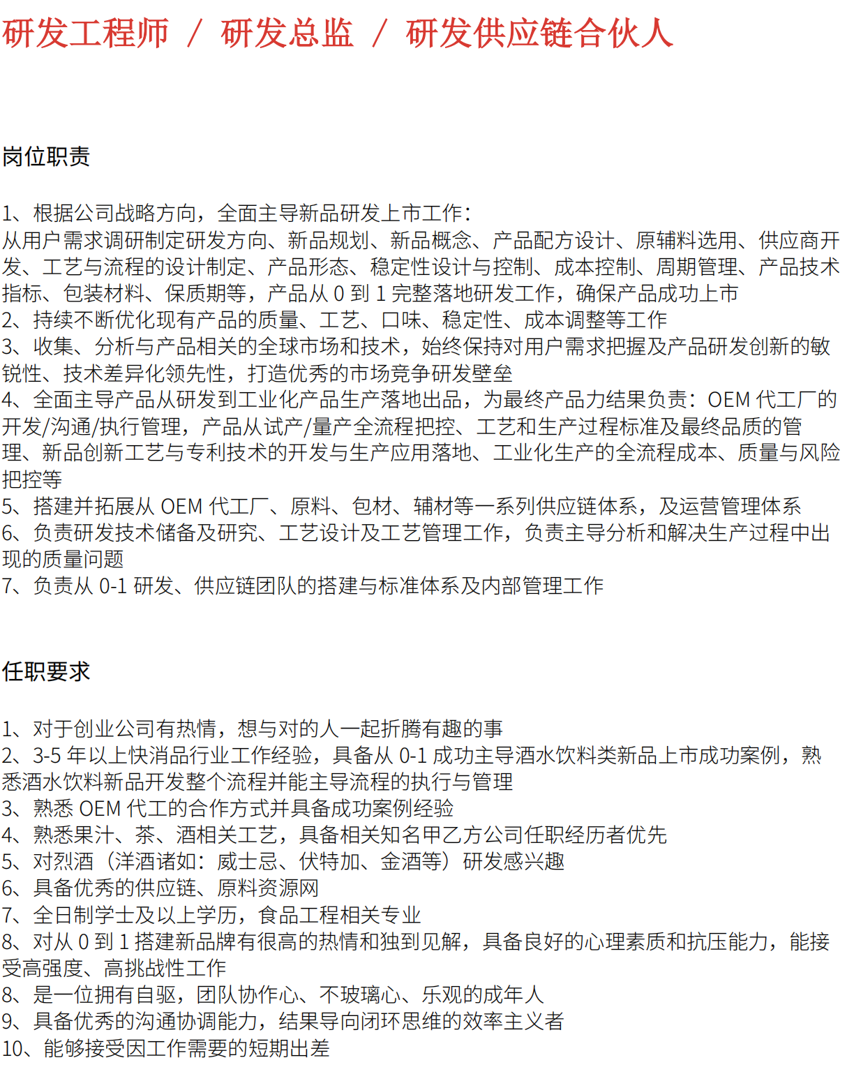 创始团队是国内低酒精行业领导品牌核心幕后操盘手,是对低酒精行业趋势与中国消费者需求价值理解最深入的创业团队,成功操盘行业领导品牌从0-1,销售团队配置低度酒品牌全国零售渠道高管、研发供应链团队集聚Aisa Top 50酒吧明星调酒师、食品饮料行业工业化资深研发等。
