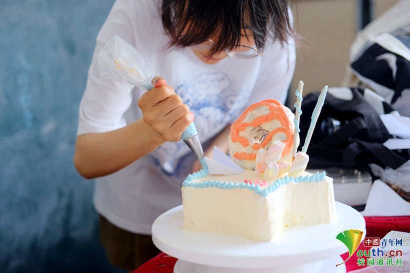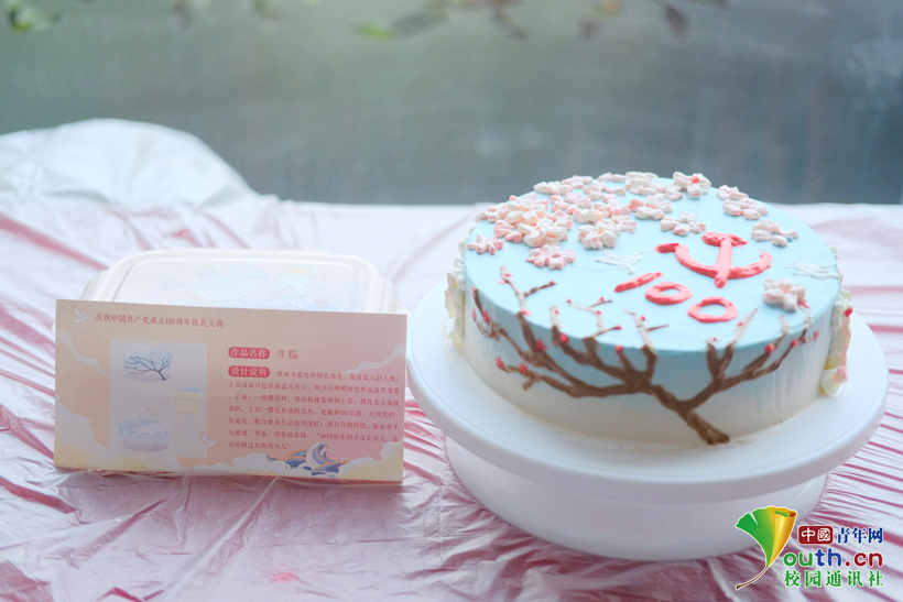 “庆百年”组用饼干堆出长城,绵延万里的巍巍长城,展现了中国人的家国情怀与中华民族坚韧不屈的傲骨。“弄潮百年”组用奶油画出了一艘小船,一百年前,中国共产党正是在一艘红船上诞生,经历了一百年的风风雨雨,中国共产党仍然坚定地向前,团结带领全国各族人民创造幸福生活和中华民族美好未来。“生临”组用蓝色与褐色渐变,象征蓝天与土地,上方摆放了中国共产党成立100周年庆祝活动标识,下方用花枝象征美好与希望,表达了对美好未来的祝愿。“万有引力”组以五角星的黄色为主色调,搭配代表青春的纸飞机和美好祝愿的甜甜圈,希望青年能够将青春梦融入中国梦,让理想展翅飞翔。